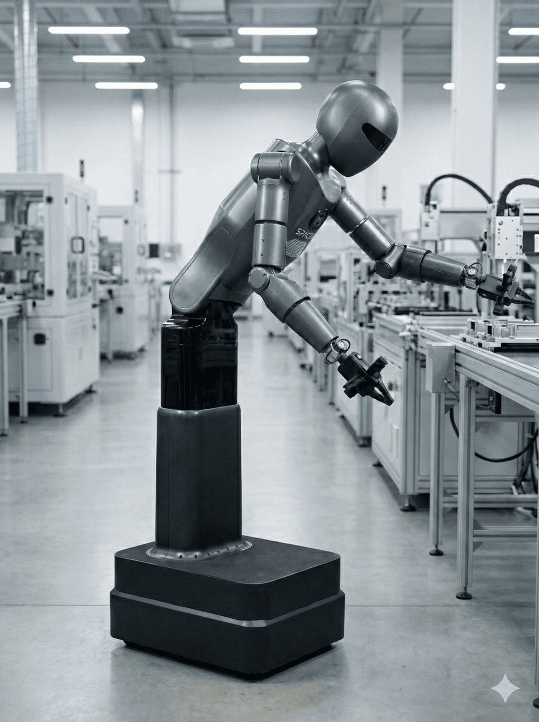 Each arm supports up to 5 kg for precise pick-and-place tasks, while the integrated base trolley carries up to 200 kg, enabling seamless transport of materials across manufacturing, logistics, and warehouse environments
